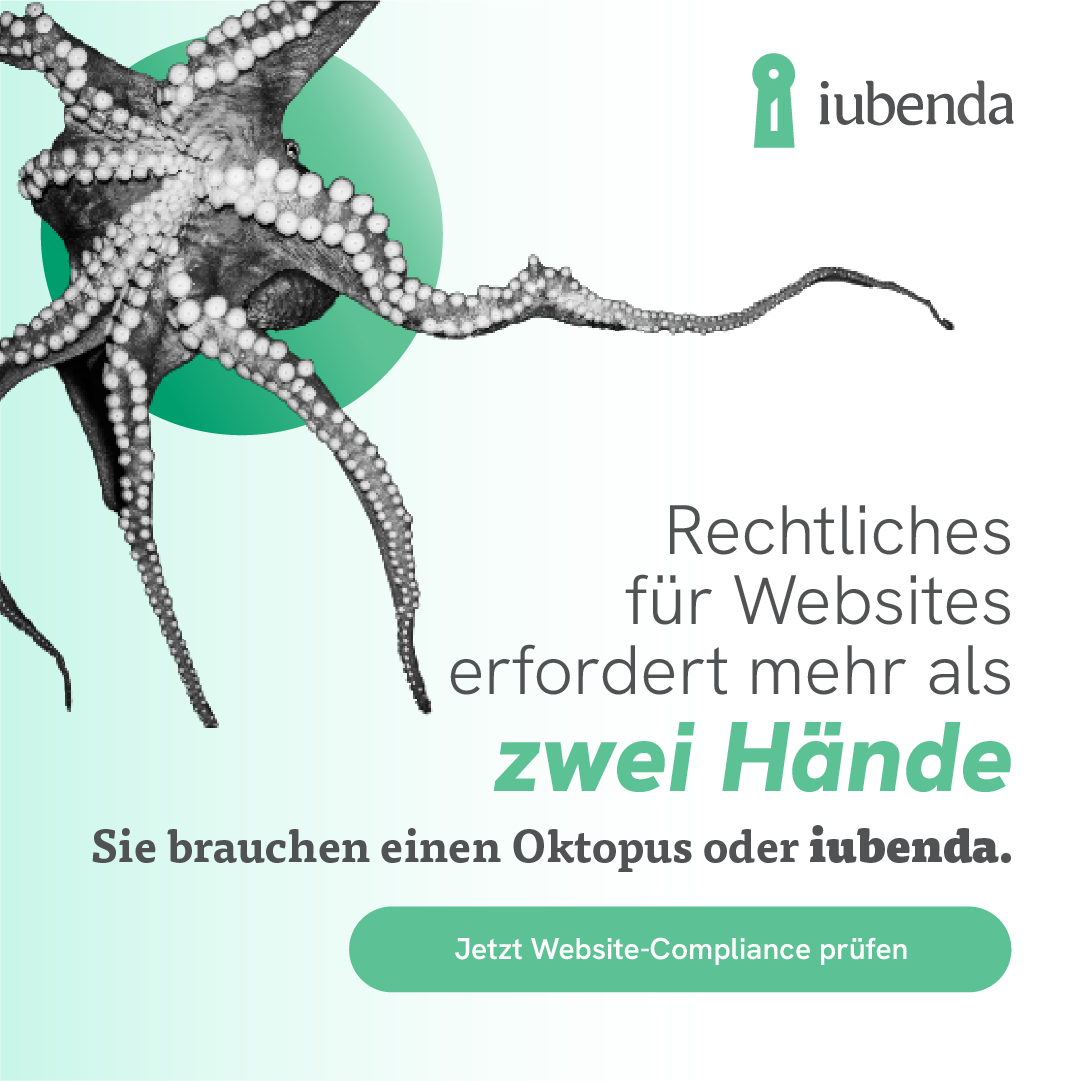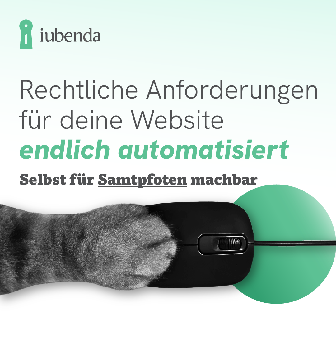 👋 Müssen Sie Ihre Website mit den Online-Gesetzen in Einklang bringen? Unser kompetenter Partner iubenda bietet benutzerfreundliche Softwarelösungen zur Erstellung von Datenschutzerklärungen, Einwilligungs-Bannern und mehr.🚀 Mit meinem Affiliate-Link[fügen Sie hier Ihren Affiliate-Link ein] erhalten Sie 10 % Rabatt auf ihren Kauf! Bei Fragen können Sie mich auch gerne kontaktieren.