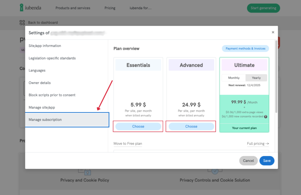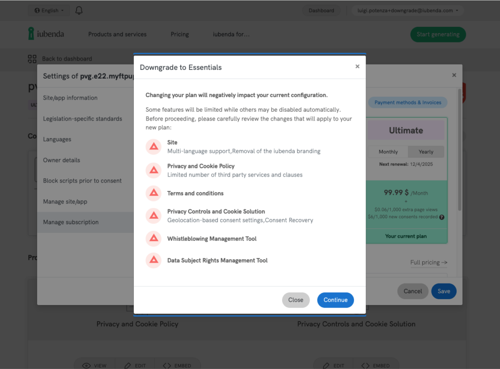 In diesem Leitfaden erklären wir, wie Sie Ihr iubenda-Abonnement ganz einfach direkt von Ihrem Konto aus zurückstufen können. Finden Sie heraus, was ein Downgrade für Ihr aktuelles Produkt und Ihre Funktionseinstellungen bedeutet. Legen wir los!