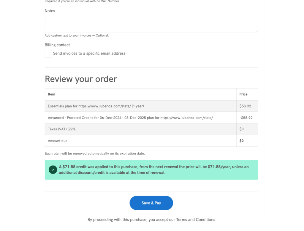 Bitte beachten Sie, dass der verbleibende Betrag aus Ihrem laufenden Abonnement Ihrem iubenda-Konto für mögliche zukünftige Käufe gutgeschrieben wird.