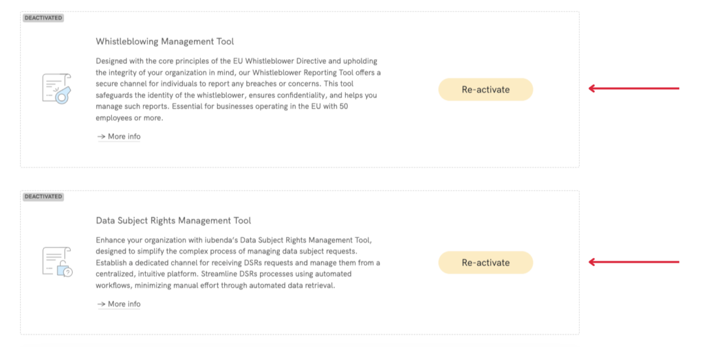 💡 Was passiert mit den verschiedenen Implementierungen auf meiner Website/App, wenn die zugehörigen iubenda-Produkte deaktiviert wurden? Ihre Datenschutzerklärung und Cookie-Richtlinie wird beispielsweise deaktiviert und zeigt die Meldung „Nicht mehr aktiv“ an, wenn Sie oder Besucher auf Ihre Website/App zugreifen. Das Einwilligungs-Banner wird hingegen nicht mehr angezeigt. Diese Einstellungen werden gelöscht, wenn Sie die aufgeführten erforderlichen Aktionen auf Ihrem Dashboard ausführen, um Produkte wieder zu aktivieren. Wie das geht, zeigen wir Ihnen unten.
