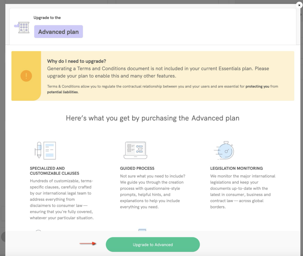 - Ist meine Datenschutzerklärung und Cookie-Richtlinie aktuell? Spiegelt sie alle datenbezogenen Aktivitäten auf meiner Seite/App wider? 👉 Essentials- und Advanced-Pläne haben eine maximale Anzahl von Klauseln, die Sie zu Ihren Rechtsdokumenten hinzufügen können!