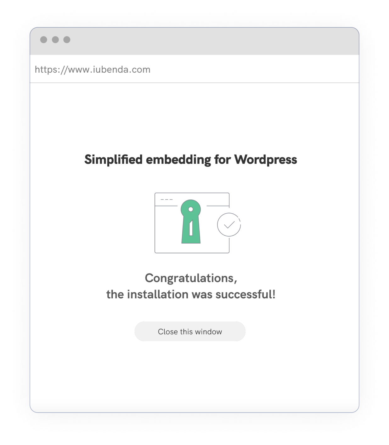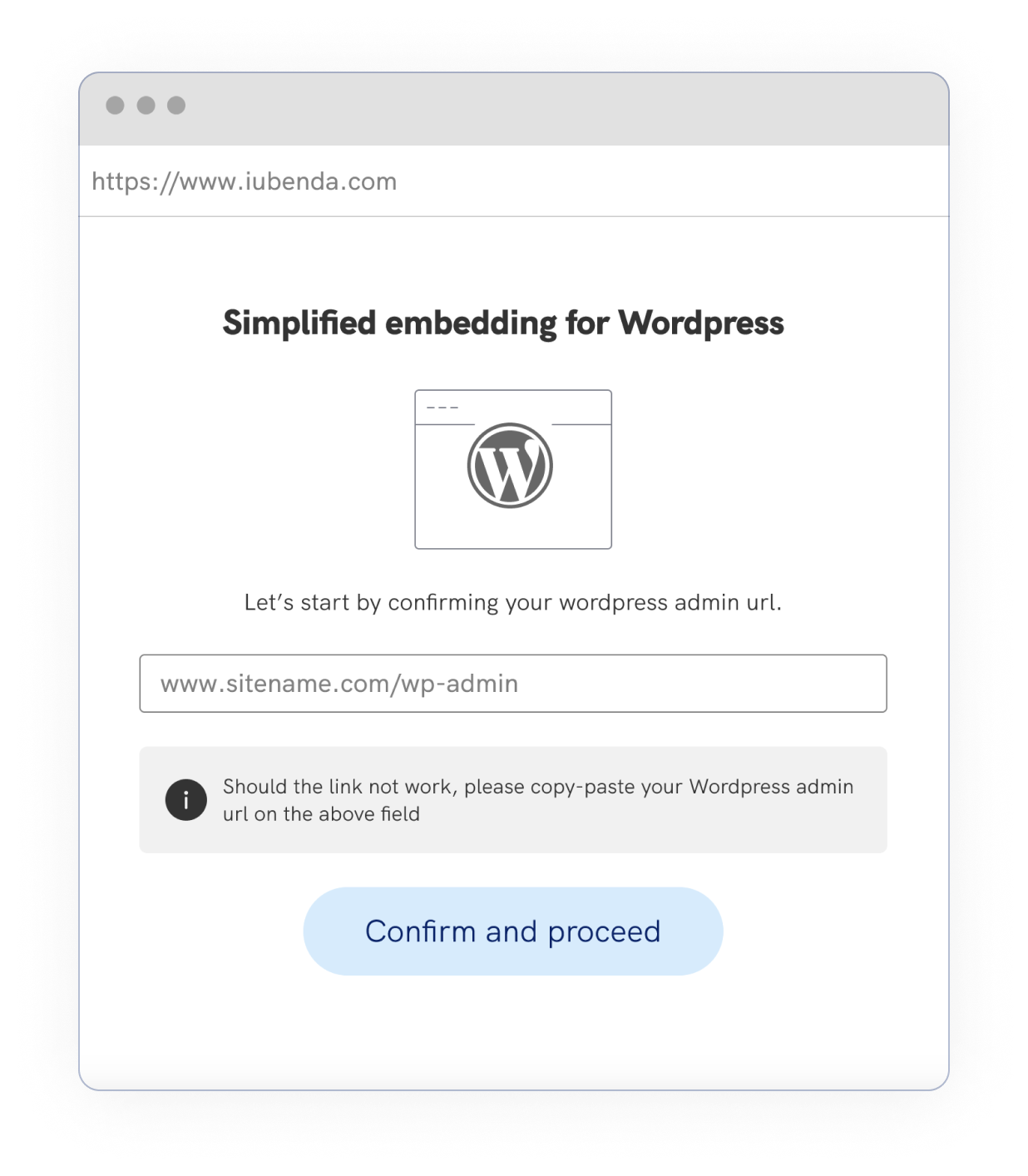 Klicken Sie auf die Option zum vereinfachten Einbetten und verbinden Sie Ihr WordPress-Konto mit iubenda.