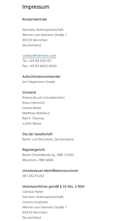 Siemens hat auch ein Impressum auf seiner „Info“-Seite: