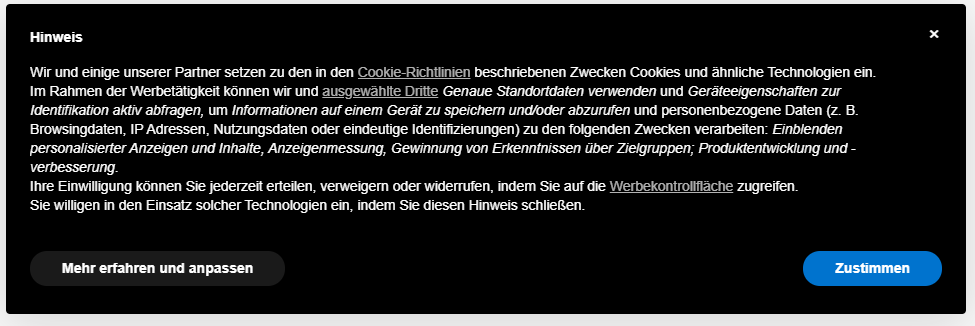 Die EU-Cookie-Richtlinie erfordert eine Einverständniserklärung der Nutzer, bevor Cookies auf dem Gerät eines Nutzers gespeichert und/oder verfolgt werden können. Das bedeutet, dass Sie, wenn Ihre Websites/Apps (oder ein von Ihren Websites/Apps genutzter Drittanbieterdienst) Cookies verwendet, dies auch tun müssen:
