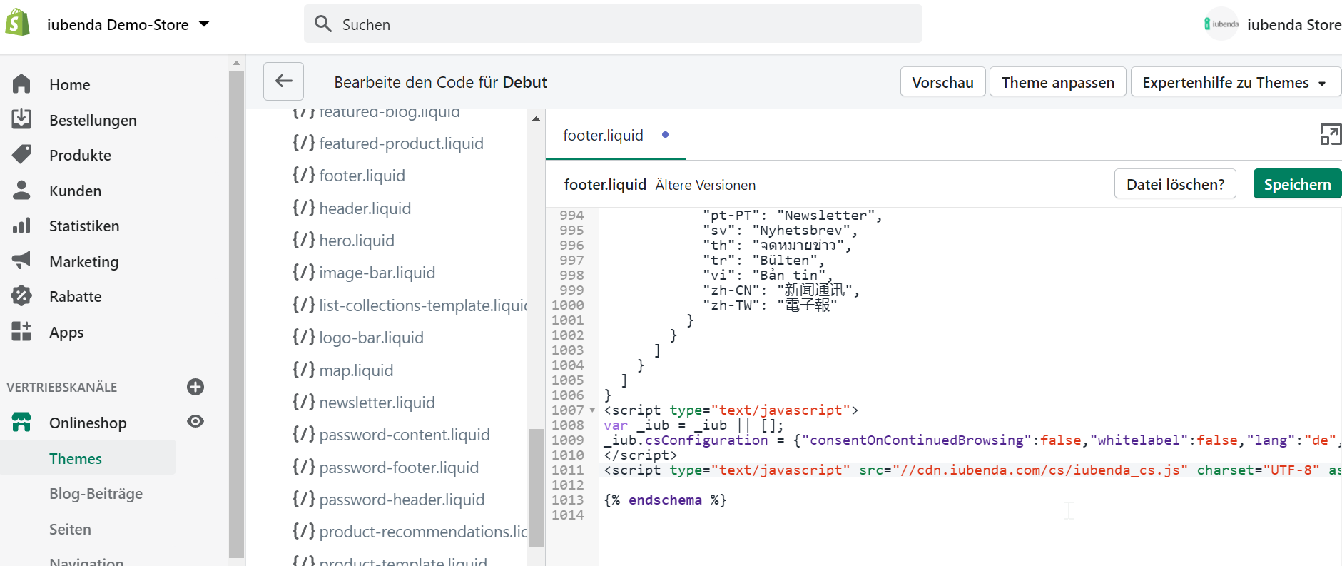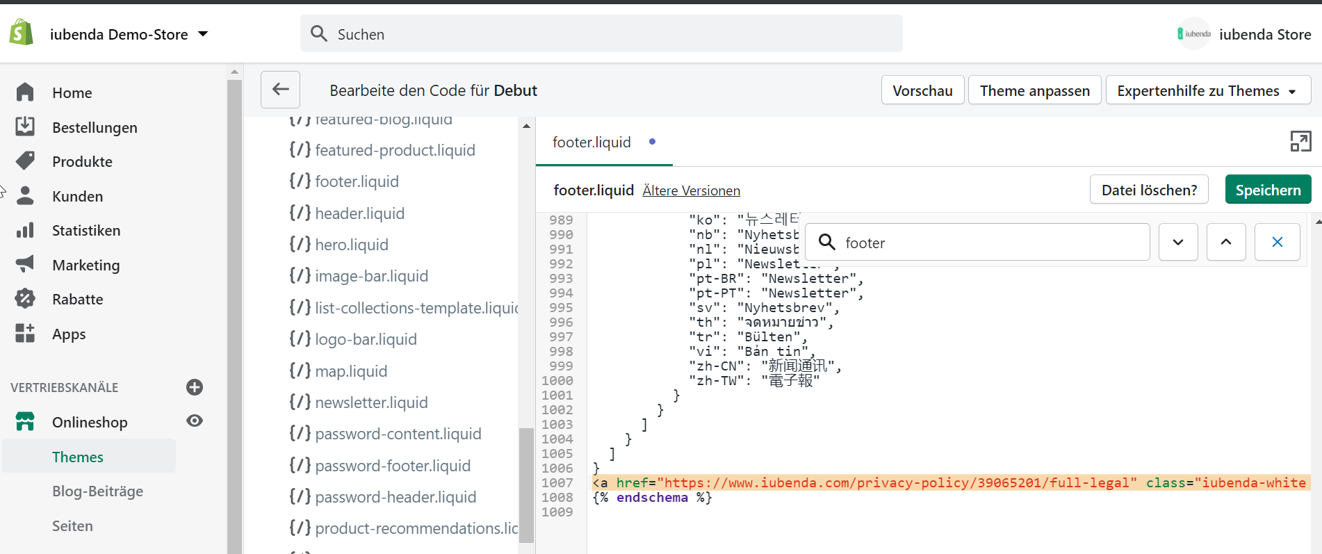 Klicken Sie anschließend oben rechts auf „Speichern“, überprüfen Sie Ihren Shop, um sicherzustellen, dass Ihnen die Platzierung des Links gefällt, und passen Sie ihn bei Bedarf an. Und schon haben Sie Ihre iubenda Datenschutzerklärung in Ihre Shopify-Seite integriert!