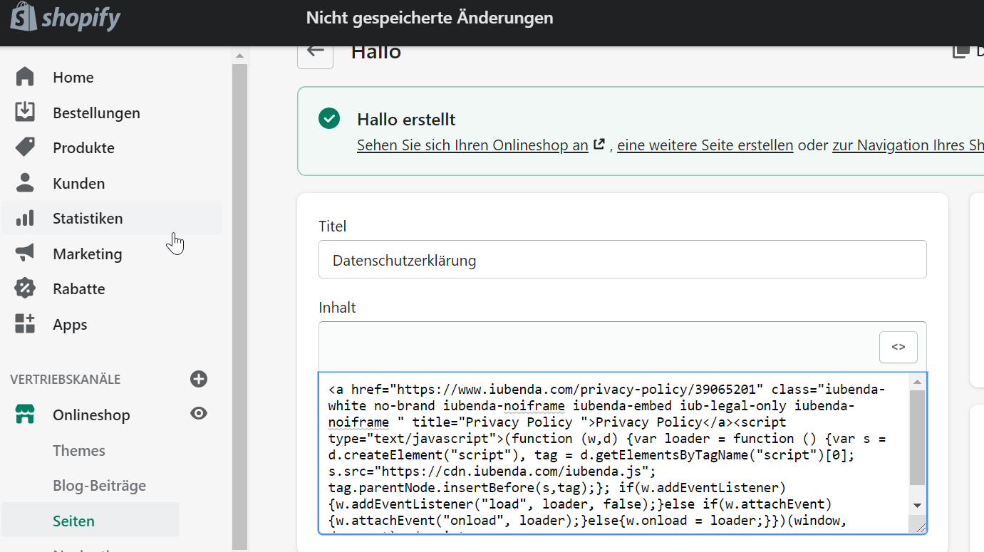 - den Text der Datenschutzerklärung direkt in Ihre Shopify-Datenschutzrichtlinien-Seite einbetten.