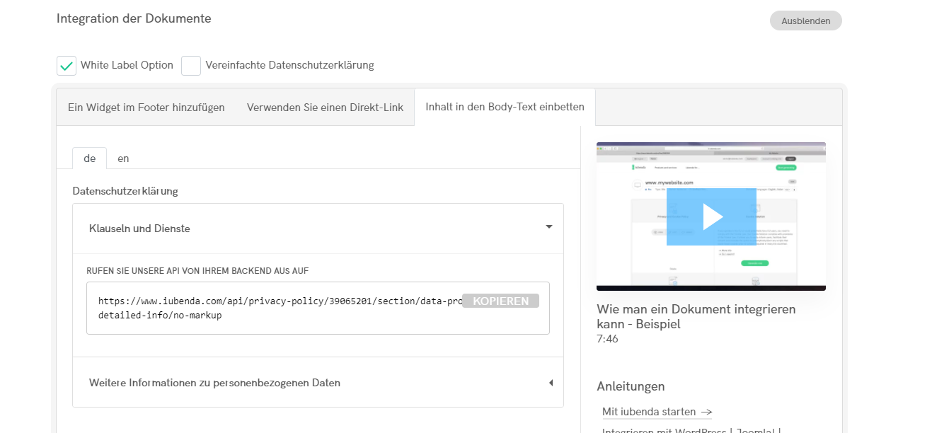 Die Option zur direkten Texteinbettung lässt Ihre Datenschutzerklärung so aussehen, als wäre diese direkt ein Teil Ihrer eigenen Website. Greifen Sie auf Ihr iubenda-Dashboard zu, klicken Sie auf [Ihre Website] > Datenschutzerklärung und Cookie-Richtlinie > Einbetten und kopieren Sie den Code unter dem Tab „Inhalt in den Body-Text einbetten“.