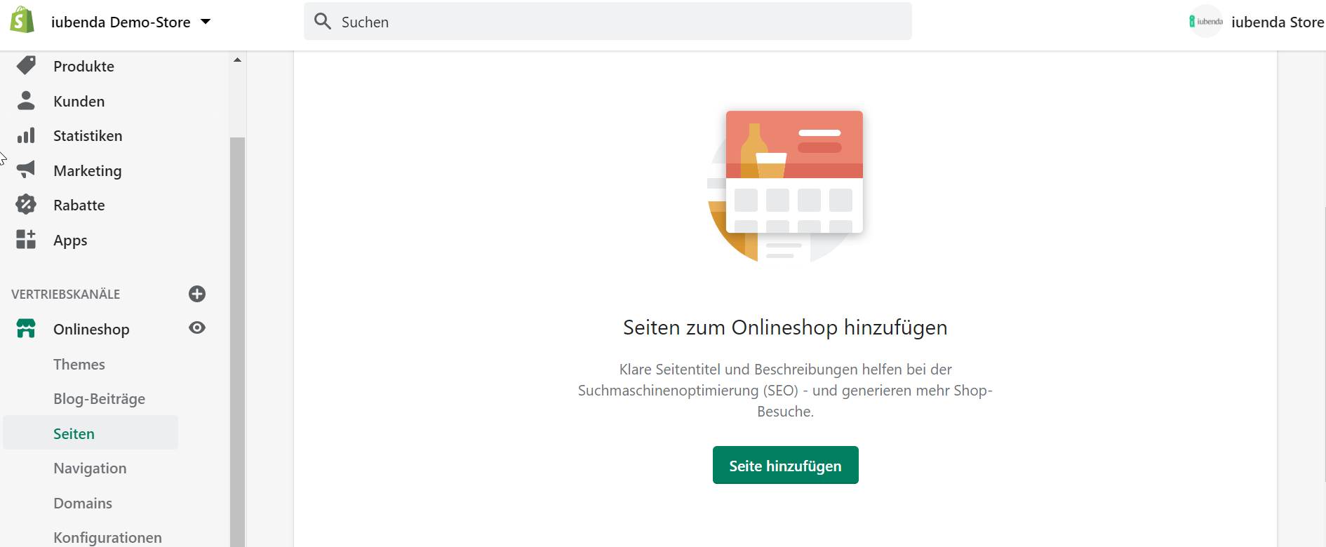 Greifen Sie auf das Admin-Panel Ihres Shopify-Shops zu und gehen Sie zu Onlineshop > Seiten. Dort klicken Sie auf „Seite hinzufügen“: