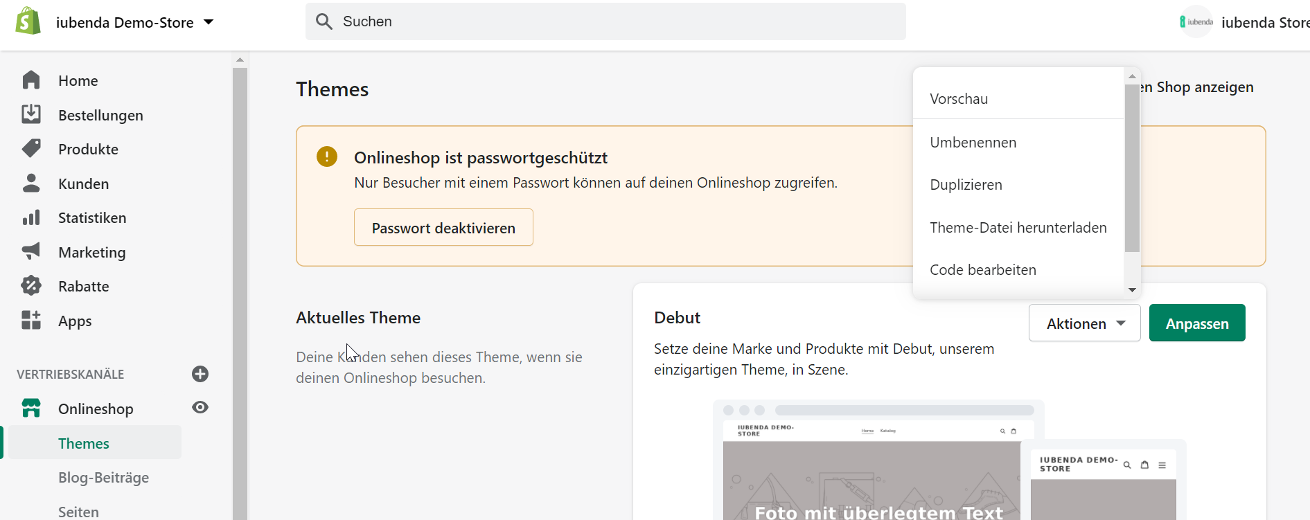 Greifen Sie auf das Admin-Panel Ihres Shopify-Shops zu und gehen Sie zu Online-Shop > Themes. Klicken Sie dort auf der rechten Seite auf Aktionen und anschließend auf Code bearbeiten, wie abgebildet: