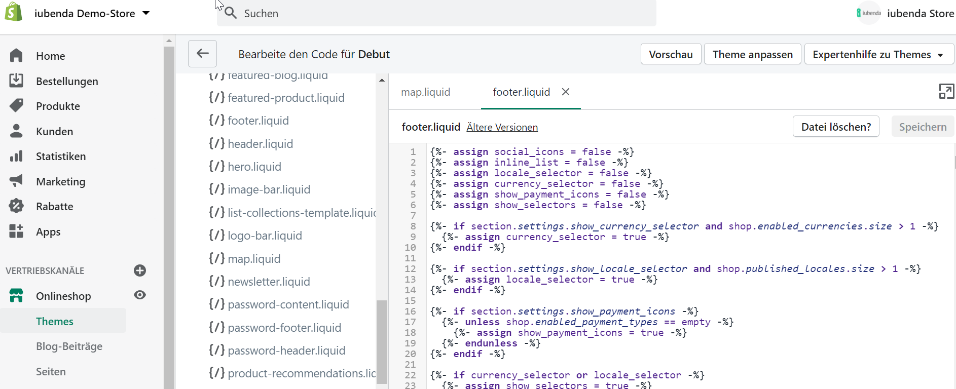 Dadurch werden Sie auf die Seite weitergeleitet, auf der Sie Ihre Theme-Dateien ändern können: Suchen Sie unter den Abschnitten und klicken Sie auf footer.liquid.
