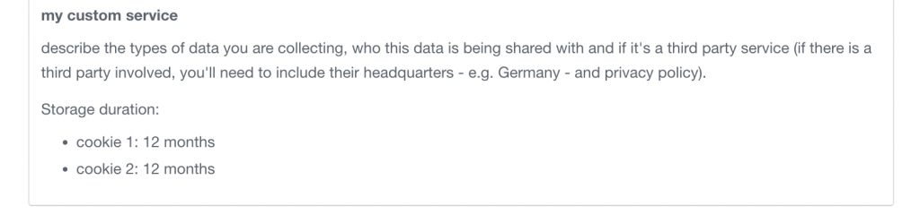 Ein weiterer großer Vorteil dieser Option besteht darin, dass die benutzerdefinierten Dienste, auf die sie angewendet wird, neben allen anderen Diensten in Ihrer Datenschutzerklärung angezeigt werden können (und nicht in einem separaten Abschnitt aufgeführt werden müssen).