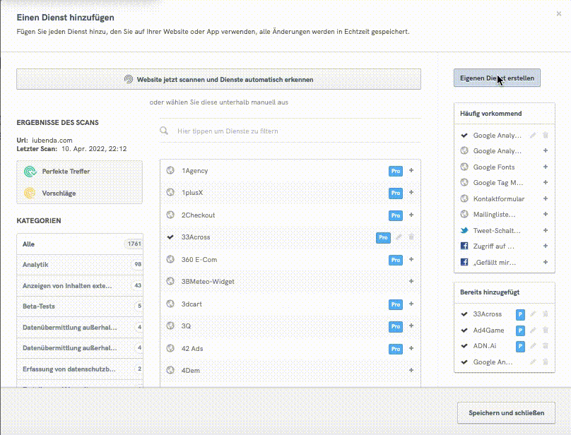 Wie bei den anderen vorgefertigten Diensten wird auch der benutzerdefinierte Dienst automatisch in den Text der Datenschutzerklärung integriert.