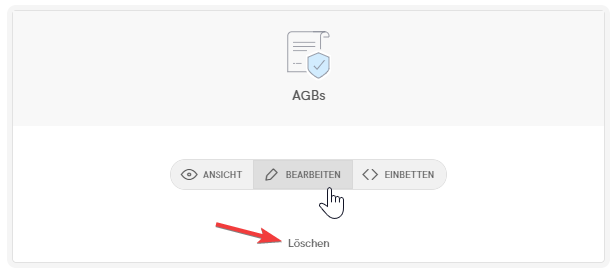 Um ein Dokument zu löschen, rufen Sie Ihr iubenda-Dashboard auf und wählen Sie die Website oder App, deren AGBs Sie löschen möchten, indem Sie diese anklicken oder auf den Button Verwalten klicken. Anschließend können Sie unten im Fenster der AGBs auf Löschen klicken.