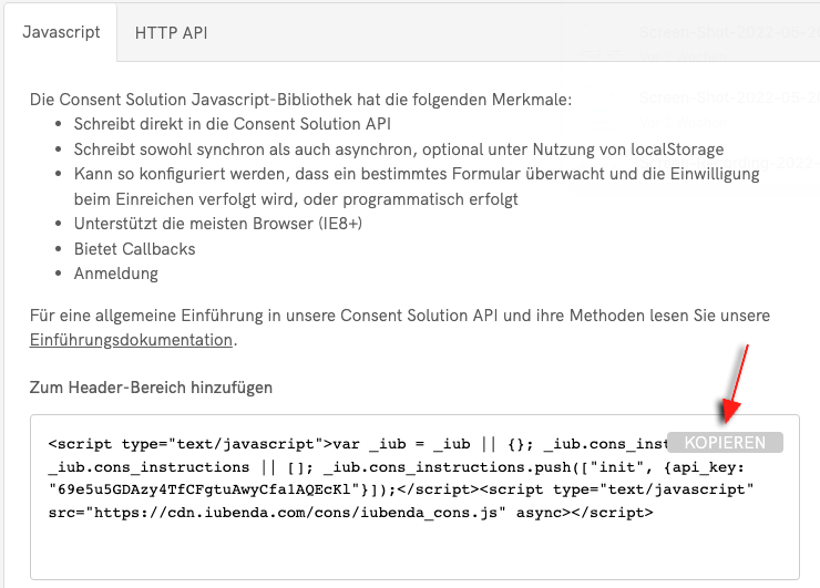 Sobald Sie Ihre Consent Database aktiviert haben, kopieren Sie den Code, den Sie unter Consent Database > Einbetten > Javascript finden: