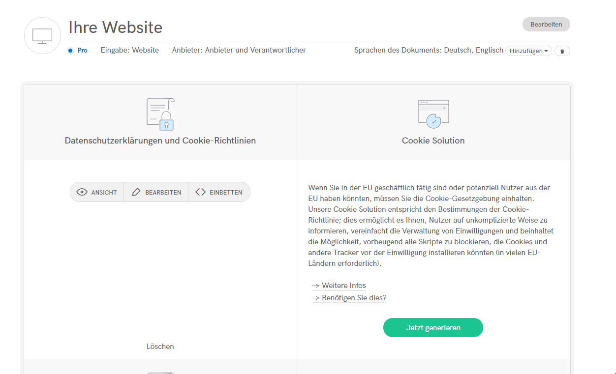Die Privacy Controls and Cookie Solution von iubenda ist in einer mehrsprachigen Version erhältlich. So können Sie Banner und die Visualisierung der Cookie-Richtlinie sowohl auf Deutsch als auch in den weiteren Sprachen des Generators verwalten (Italienisch, amerikanisches Englisch, britisches Englisch, Spanisch, Niederländisch, Französisch, Deutsch, Russisch, Brasilianisches Portugiesisch, Portugiesisch) und Dänisch.