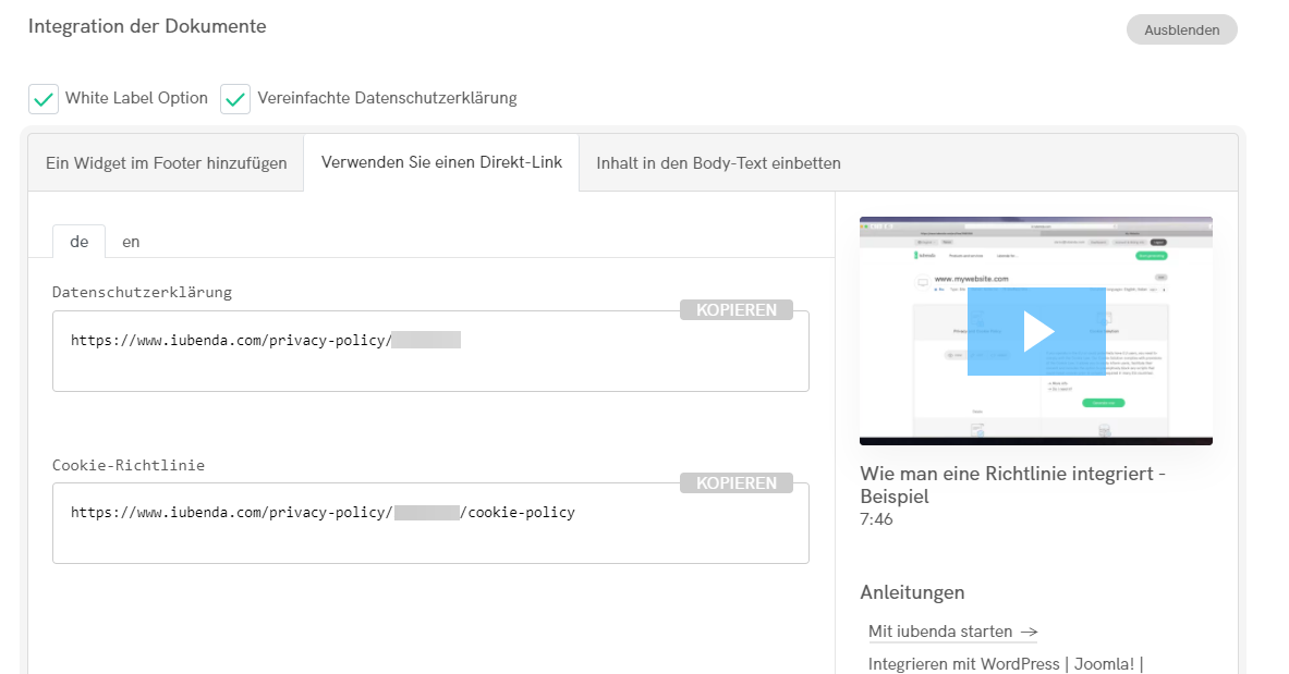 • Sie können frei wählen, ob Sie den Link zur Cookie-Richtlinie auf Ihrer Website einfügen möchten (dies ist völlig freiwillig, da ein Link zur Cookie-Richtlinie automatisch in die mit unserem System erstellte Datenschutzerklärung eingefügt wird).