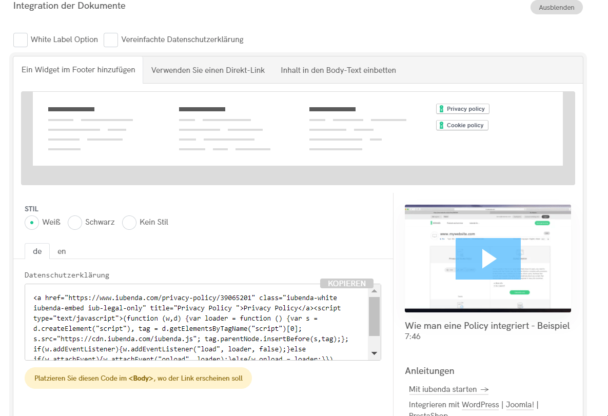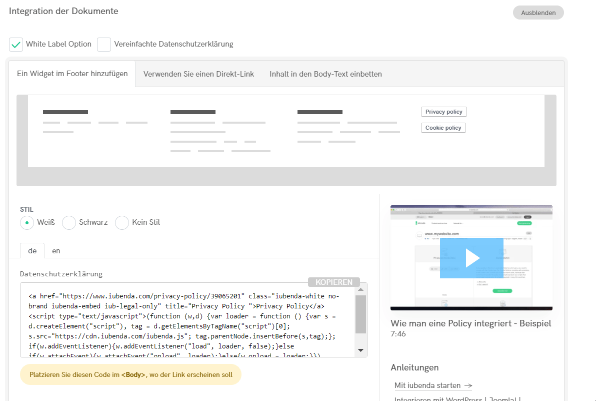 Wenn Sie vermeiden möchten, dass Nutzer von der Verwendung eines Generators erfahren, stehen Ihnen einige simple Einstellungen zur Verfügung, die Sie bei der Gestaltung Ihrer Datenschutzerklärung für die Einbettung in Ihre Website verwenden können. Diese entfernen das Branding von iubenda so weit wie möglich (es wird kein Hinweis darauf gegeben, dass das Dokument generiert wurde).