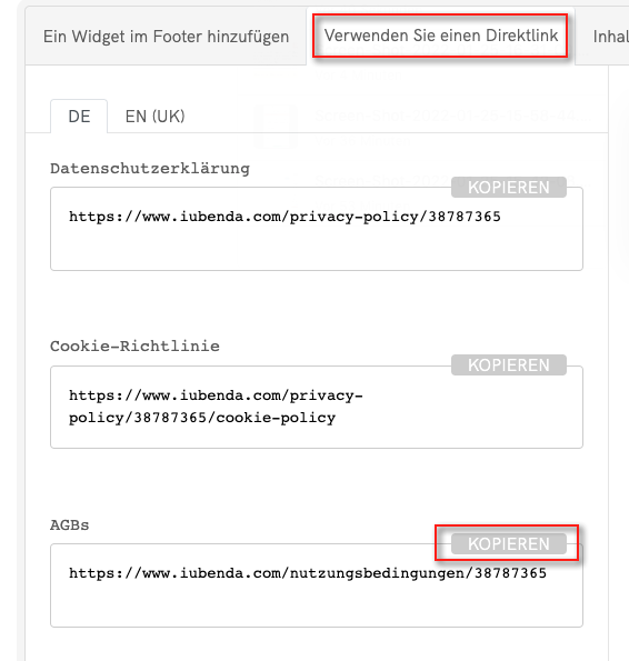 Um einen Direktlink hinzuzufügen, klicken Sie auf den Tab Verwenden Sie einen Direktlink und dann auf den KOPIEREN-Button unter dem Abschnitt “AGBs”