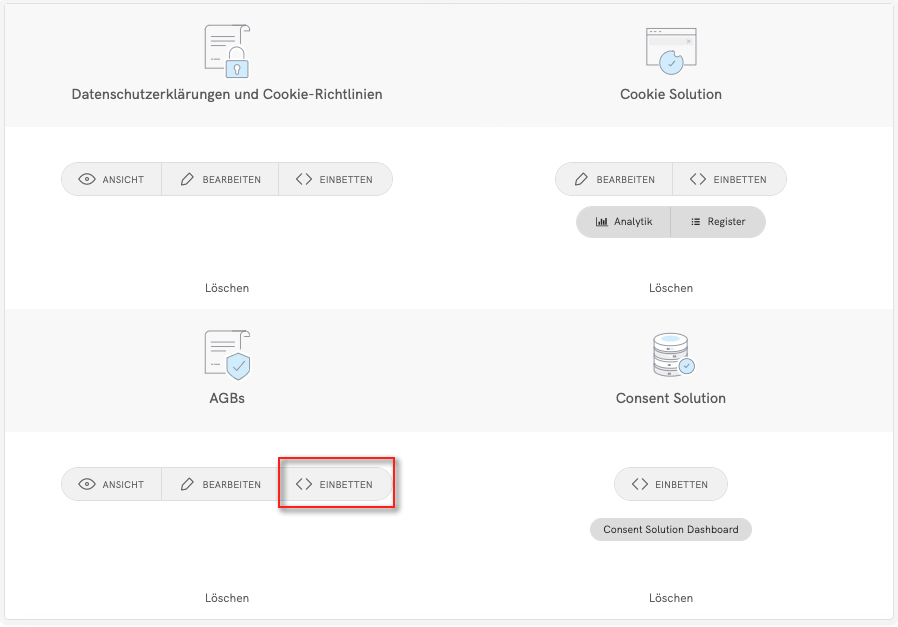 Um loszulegen, gehen Sie zunächst auf Ihr iubenda-Dashboard und klicken Sie auf [Ihre Website] > AGBs > Einbetten