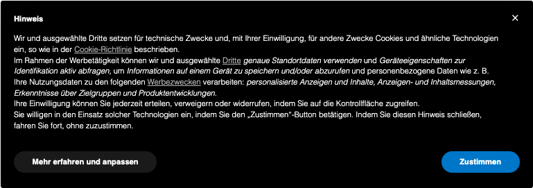 Der Text des Banners v2 wurde wesentlich verlängert, um die Anforderungen des IAB zu erfüllen. Der zusätzliche Text enthält wesentliche Angaben im Zusammenhang mit den erweiterten Optionen, die wir in den folgenden Abschnitten erwähnen.