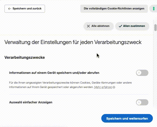 Publisher können festlegen, dass für bestimmte Zwecke nur das berechtigte Interesse und nicht die Einwilligung eine brauchbare Rechtsgrundlage darstellt. - Die unterstützten Anbieter auf diejenigen beschränken, die in ihren Datenschutz- und Cookie-Richtlinien aufgeführt sind