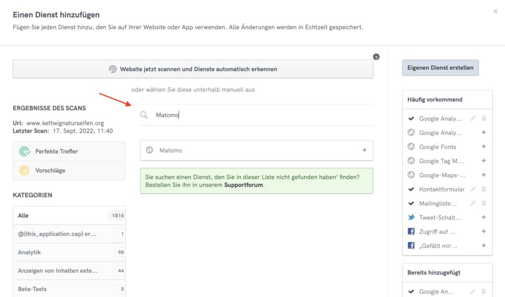Fügen Sie zuerst „Matomo“ zu Ihrer Datenschutzerklärung aus der Auswahl der Dienste in Ihrem iubenda Dashboard hinzu.