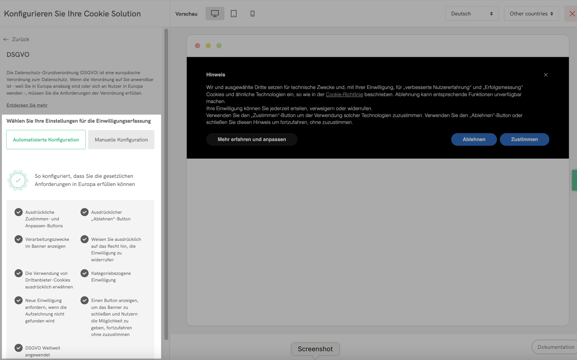 Unsere Cookie-Lösung hilft Ihnen, die Anforderungen der DSGVO, ePrivacy und mehr vollständig zu erfüllen. Sie erhalten nicht nur die komplette Kontrolle über Ihre Cookie-Banner und -Einstellungen, sondern sind dank der automatisierten DSGVO-Standardkonfiguration auch einen Schritt weiter, indem Sie die wichtigsten Punkte der Nichteinhaltung verhindern, die in der NOYB-Analyse berücksichtigt wurden. Und natürlich ermöglicht es Ihnen, die Vorschriften der DSGVO und der nationalen Datenschutzbehörden gesetzeskonform zu erfüllen.