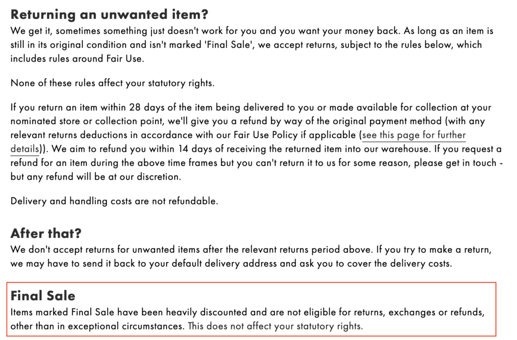 ASOS, too, makes clear in its Return and Refund Policy that items that are marked as “Final Sale” can’t be returned or refunded.
