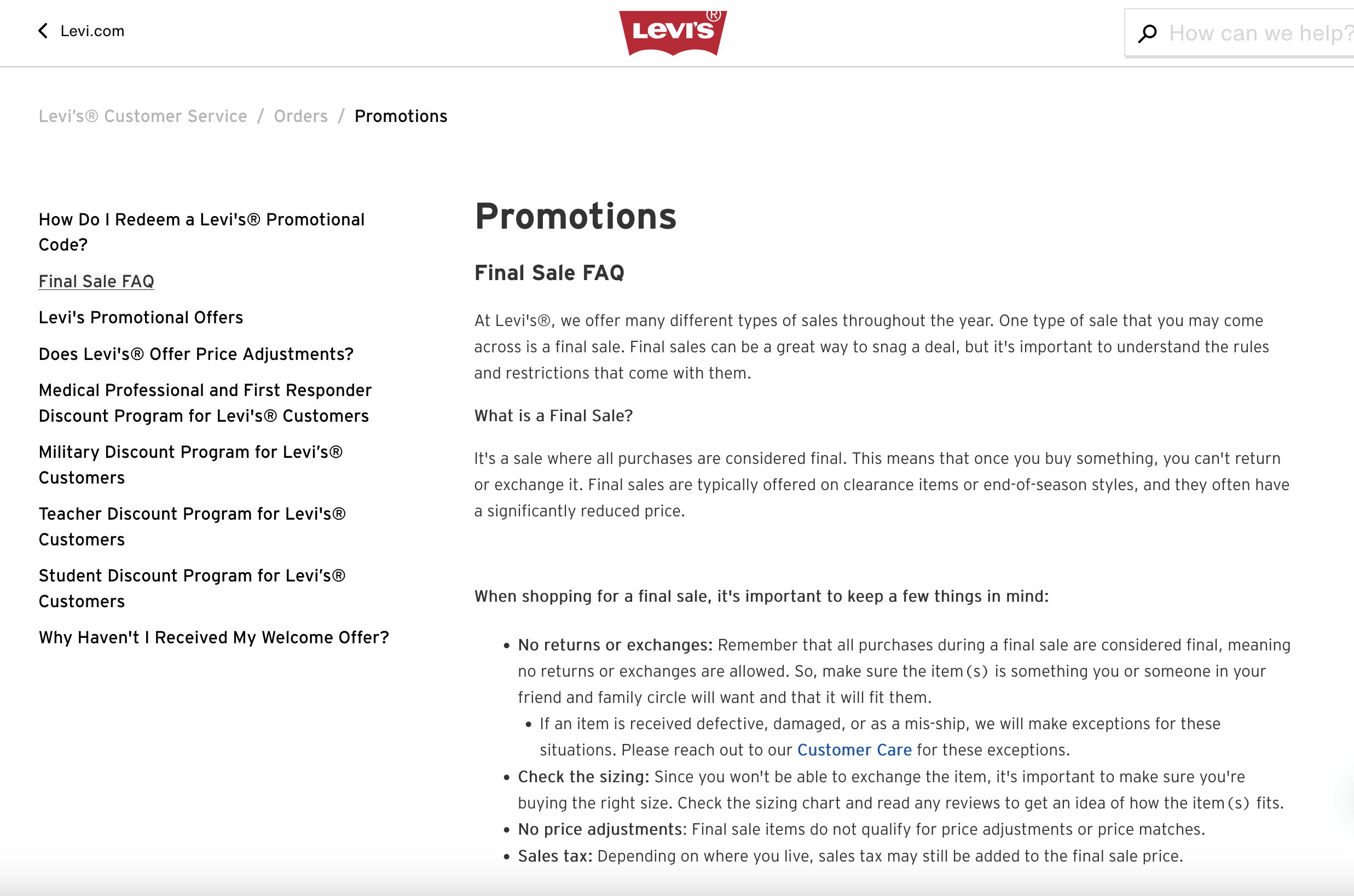 Levi’s added a Final Sale FAQ to explain what a Final Sale is and all relevant details that apply in this case. They also explain that exceptions apply for damaged items or when the wrong item is sent.