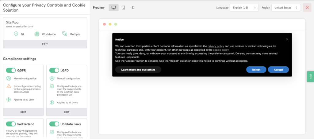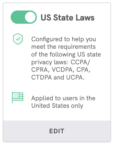 Before embedding your new policies and privacy tools in your site, make sure you’ve turned on the “US State Laws” setting in your dashboard. This setting is usually activated during guided setup based on your answers to a few simple questions.