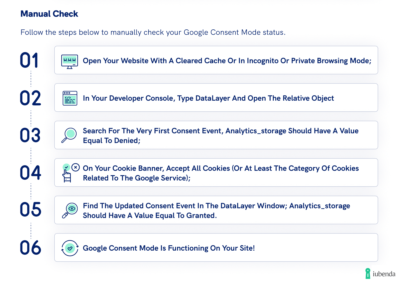 The easiest and fastest way to enable the Google Consent Mode is with a Google-certified CMP, like iubenda. This is also the method that Google recommends, as it makes the implementation a lot easier on your side.