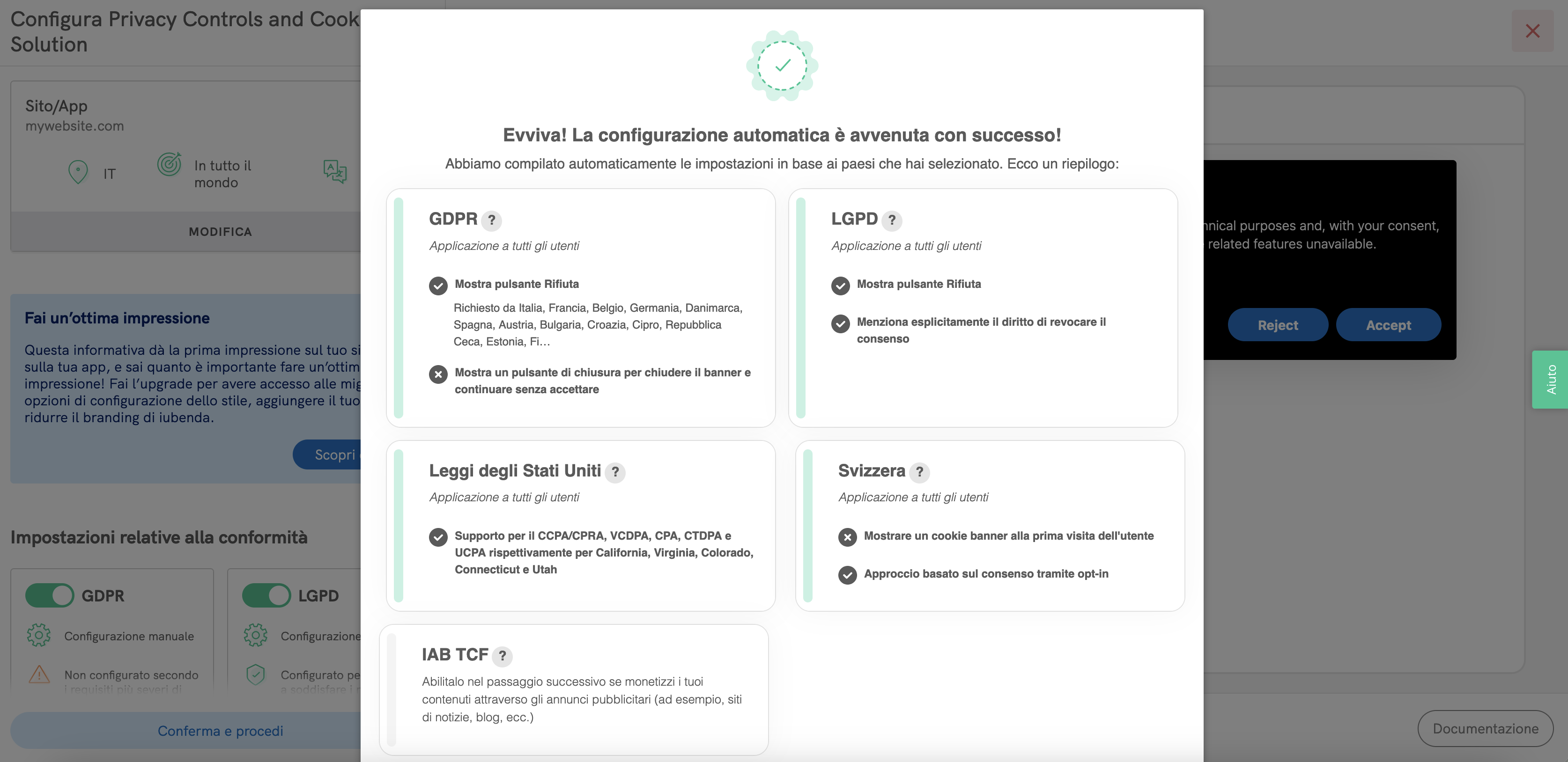 Customize your banner by selecting the countries you operate in or follow our site scanner’s recommendations. Upgrade to a paid plan to add your own style and remove iubenda’s branding.