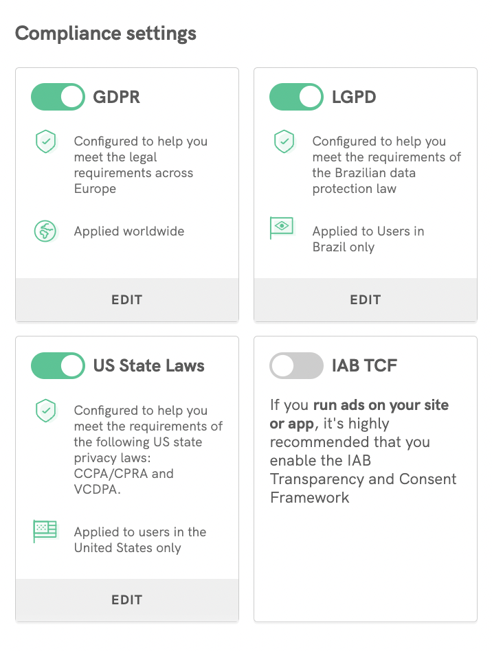 When you click EDIT at the bottom of each compliance item, you will have full access and control over all settings and banner behavior related to that scope.