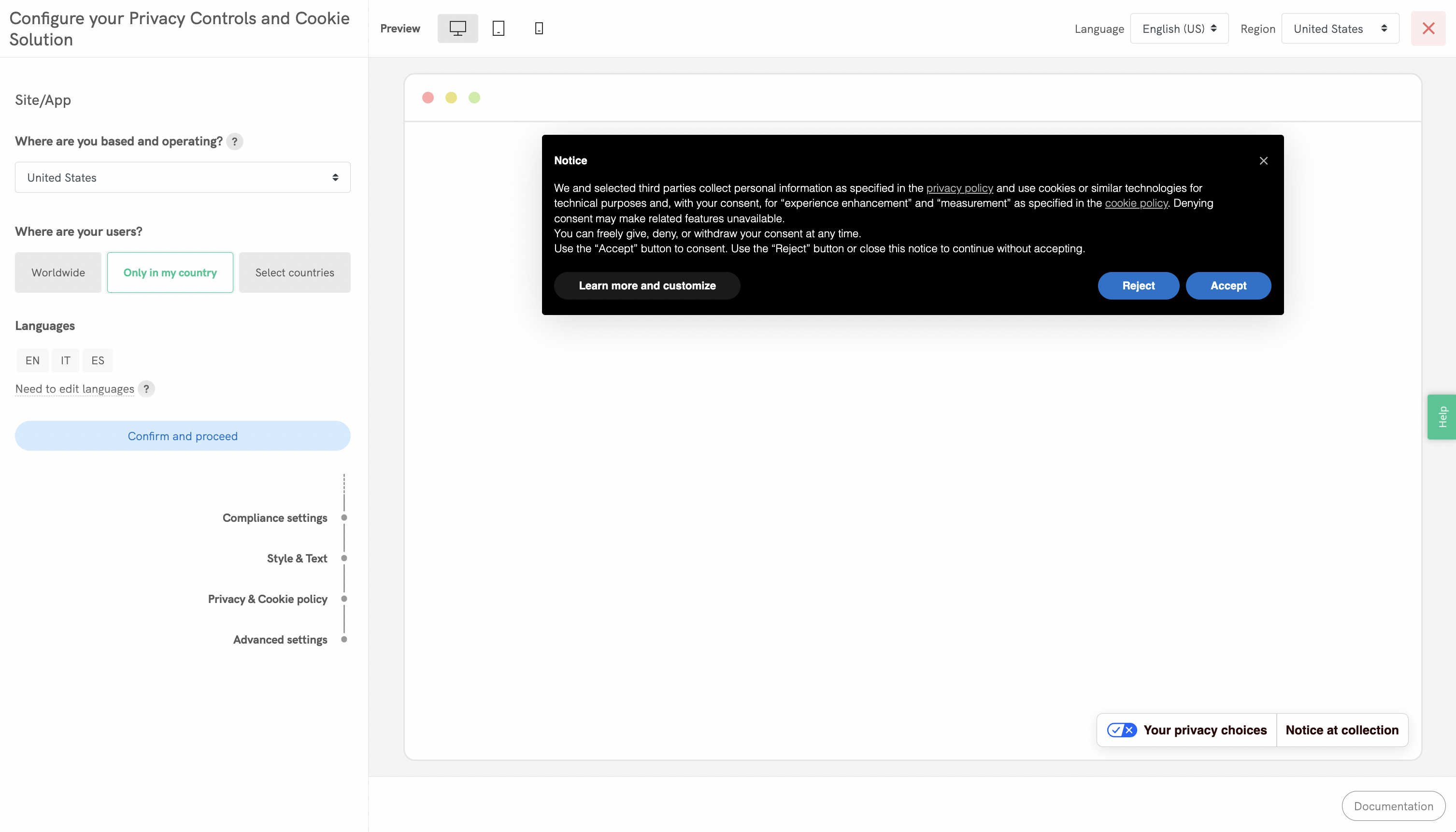 💡 Any changes you make will be instantly shown in the preview area on the right side of the page. You can also switch to different views (desktop, tablet, mobile), display the banner in other languages (if you have them enabled) or preview the differentiated per-country copy (if some compliance setting is applied only to a subset of users).