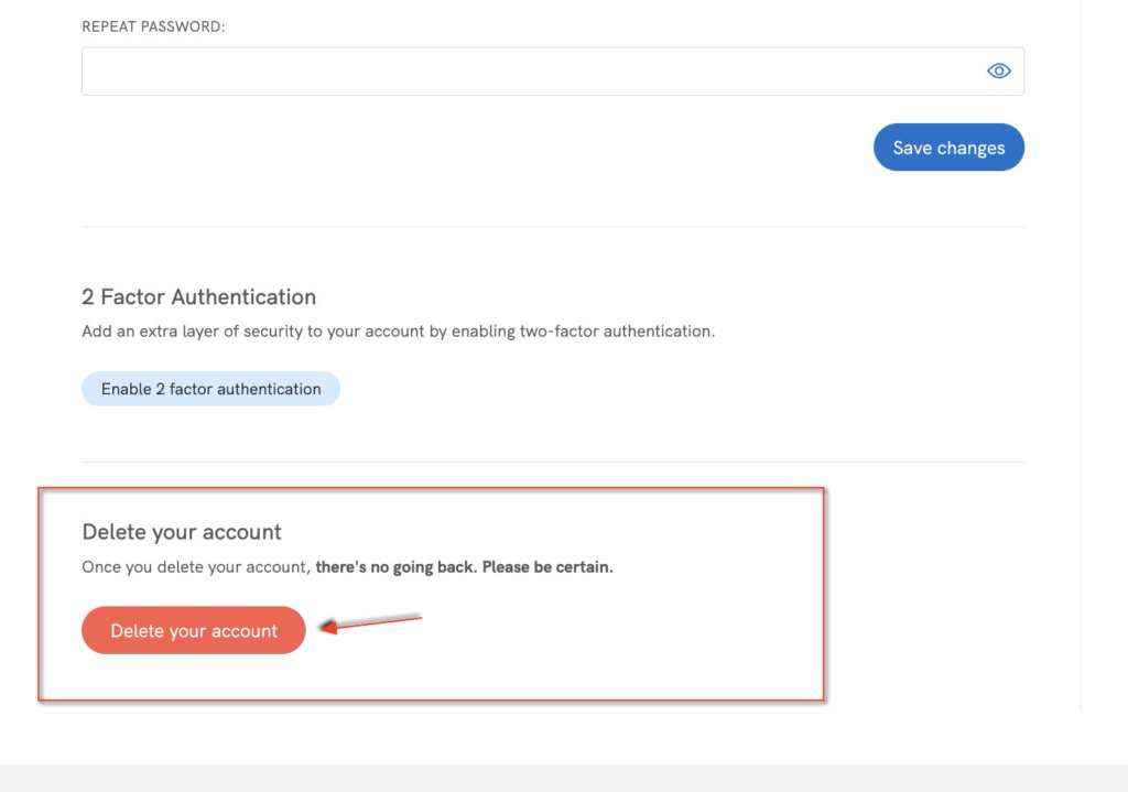 - Scroll to the bottom to click on the red “Delete your account” button.