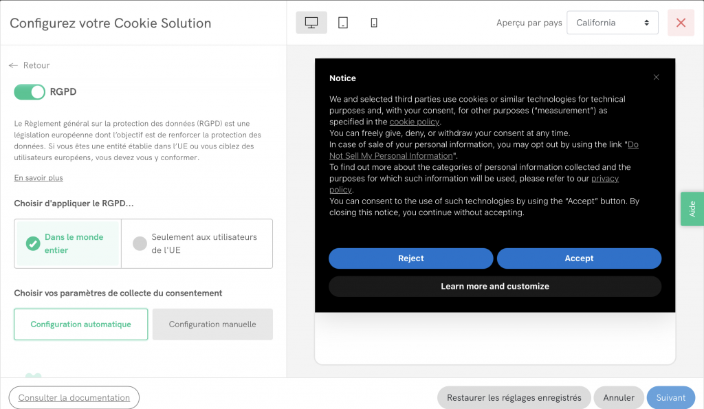 Notre solution vous permet d’appliquer automatiquement les normes de la loi CCPA, celles du RGPD ou les deux aux mêmes utilisateurs lorsque vous êtes légalement tenu de le faire.