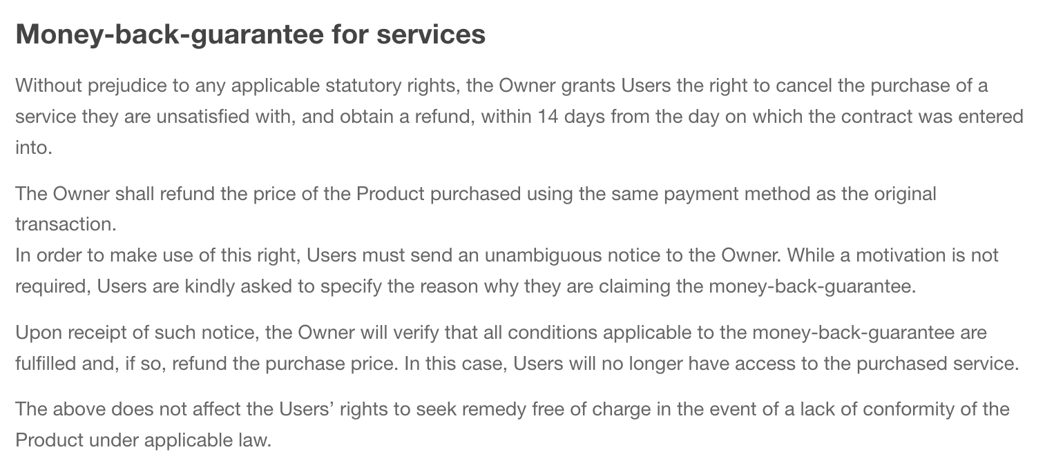 At iubenda, we also have a money-back guarantee in our Terms and Conditions document. It allows our customers to receive a full refund within 14 days of their purchase, no questions asked.