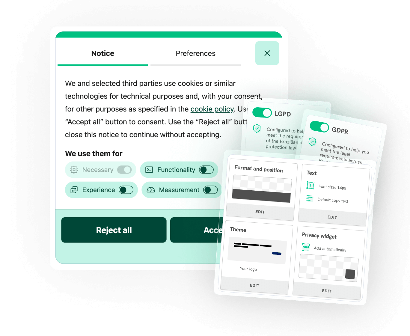 GDPR, ePrivacy, CCPA, LGPD, nFADP, Google’s policies. Your banner adapts to the right rules, wherever your visitors are.