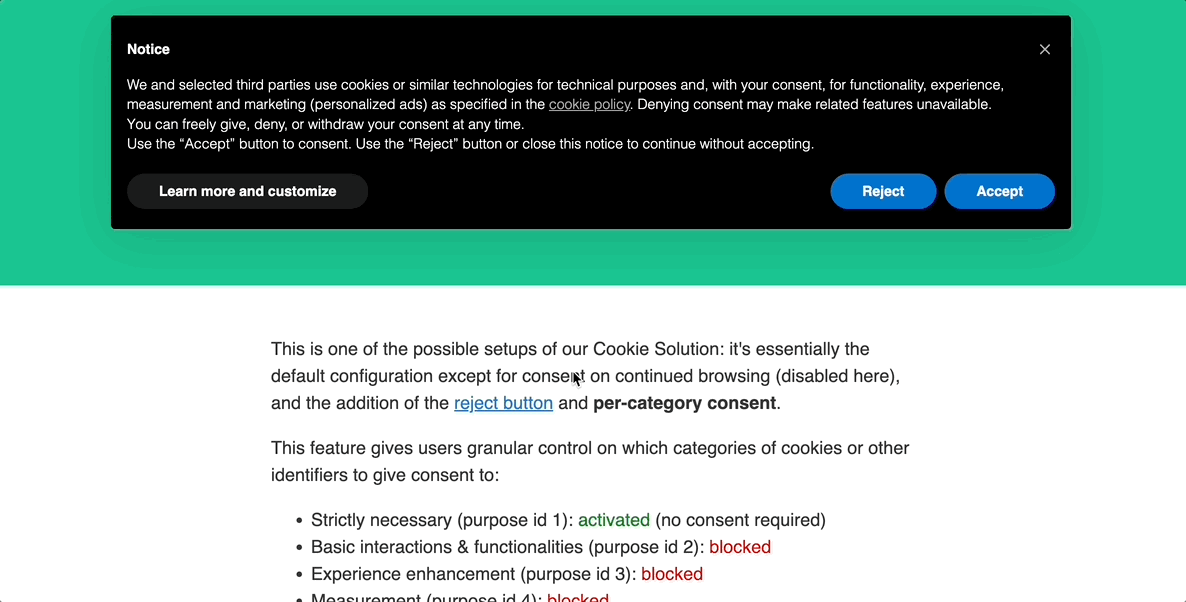 - “Accept” and “Learn more and customize” buttons will be force-enabled, as required by IAB.
