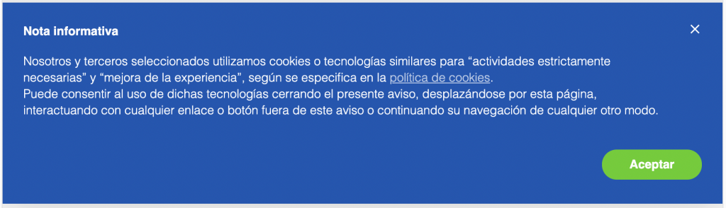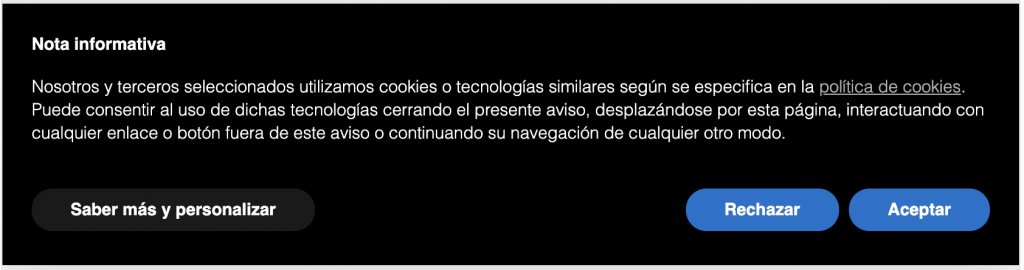 • mostrar un aviso o banner de cookies en la primera visita del usuario que sea claramente visible (puedes consultar los contenidos que debería tener el banner aquí);