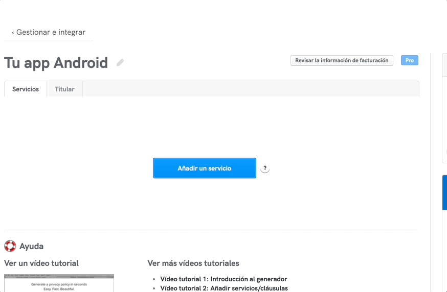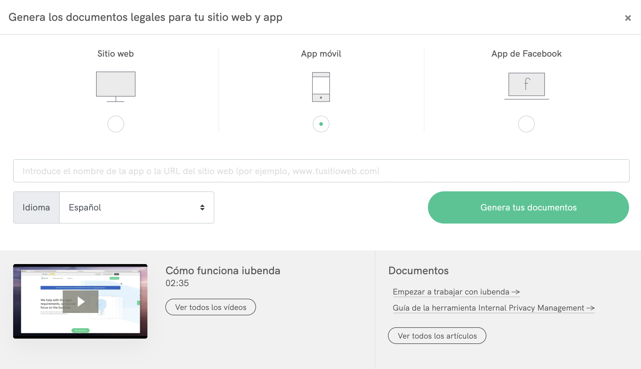 Genera tu propia política de privacidad para tu app móvil haciendo clic en Genera tus documentos > App móvil: