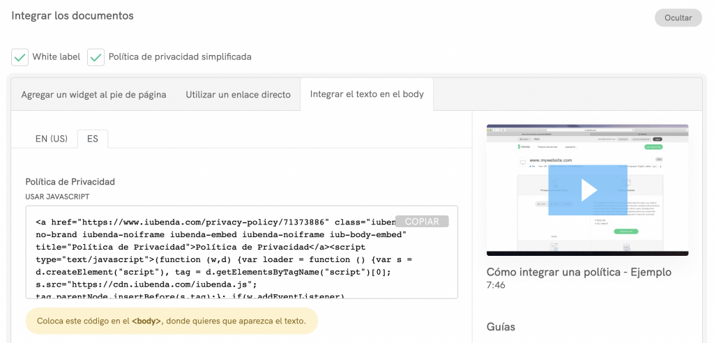 La opción de integración directa de texto hace que tu política de privacidad parezca una parte nativa de tu propio sitio web. Accede a tu dashboard de iubenda, haz clic en [Tu sitio web] > Política de Privacidad y Cookies > Integrar y copia el código que encontrarás debajo de la pestaña Integrar el texto en el body.