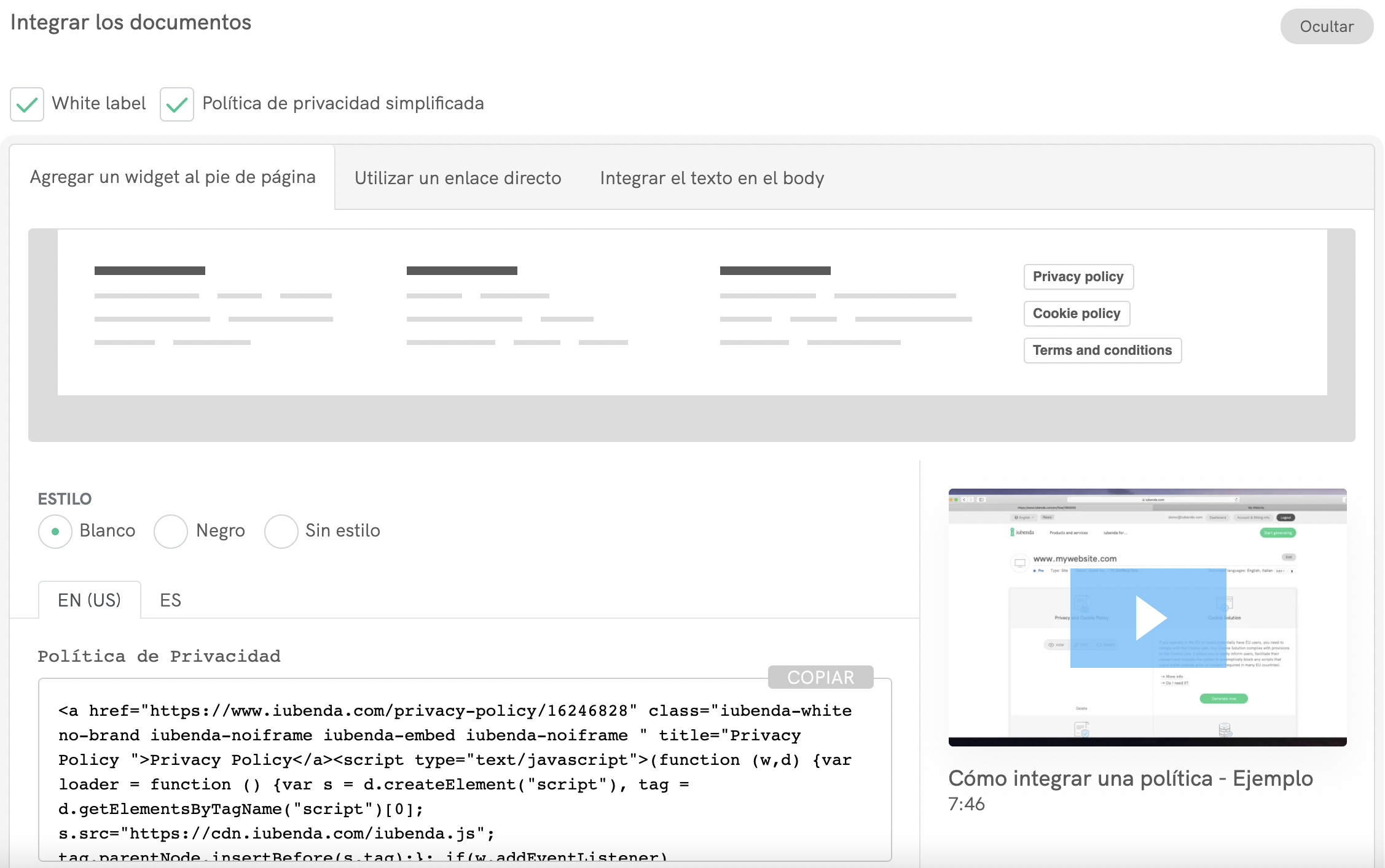 Accede a tu dashboard de iubenda, haz clic en [Tu sitio web] > Política de Privacidad y Cookies > Integrar y copia el código que se encuentra debajo de la pestaña Agregar un widget al pie de página.