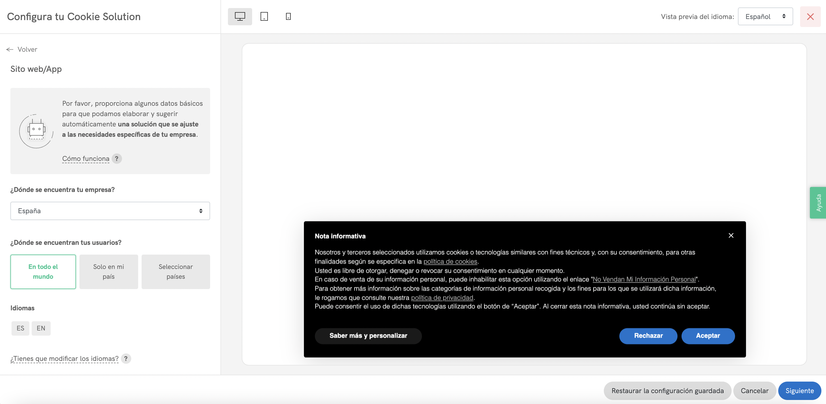 💡 Cualquier cambio que realices se mostrará instantáneamente en el área de vista previa en el lado derecho de la página. También puedes cambiar a diferentes vistas (escritorio, tableta, móvil), mostrar el banner en otros idiomas (si los tienes habilitados) u obtener una vista previa del texto diferenciado por país (si algún ajuste de conformidad se aplica solo a un subconjunto de usuarios).