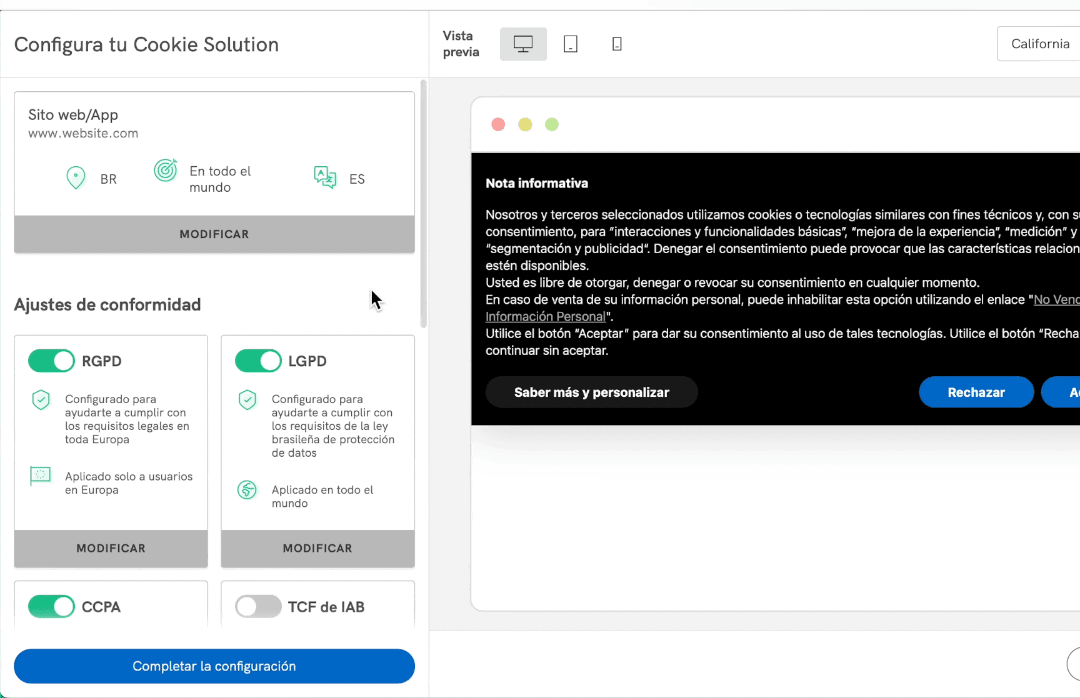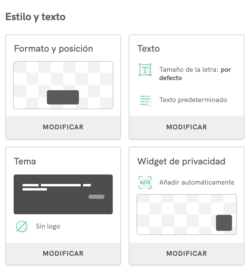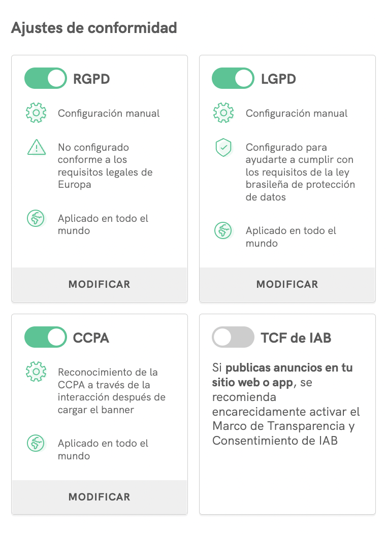 Nuestras configuraciones automatizadas están preparadas para cumplir con los requisitos más estrictos de las principales legislaciones y regulaciones internacionales, pero puedes cambiar cada configuración haciendo clic en MODIFICAR en la parte inferior de cada recuadro.