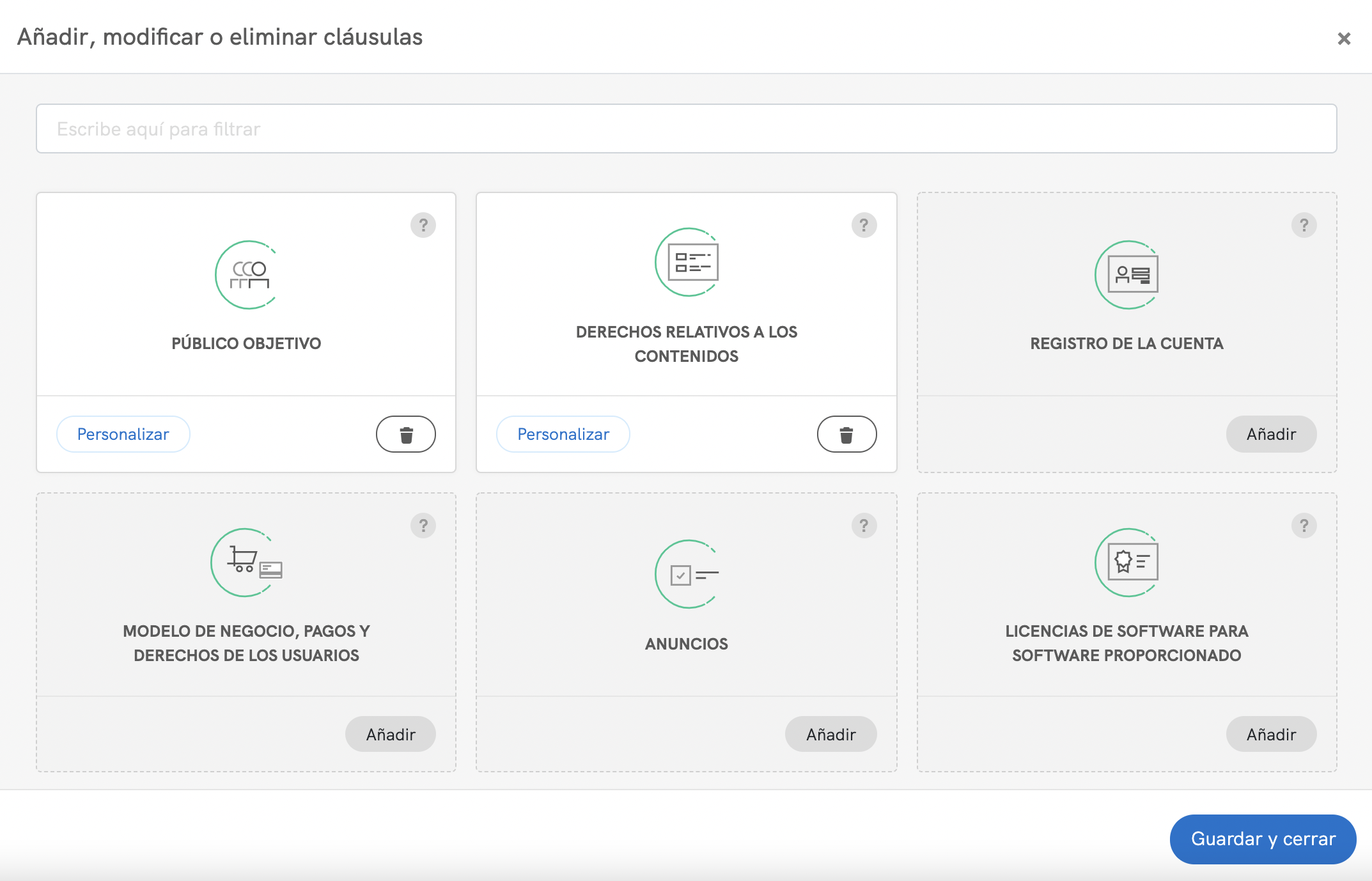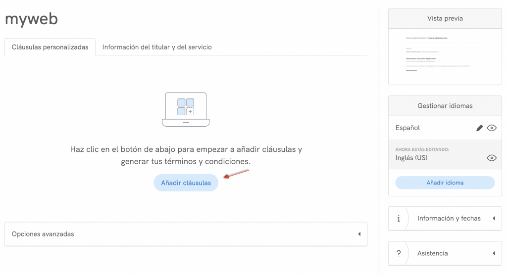 Esto abrirá una ventana que te permitirá seleccionar y editar las cláusulas que quieras añadir. Si es la primera vez que usas nuestro Generador de Términos y Condiciones, verás lo siguiente: