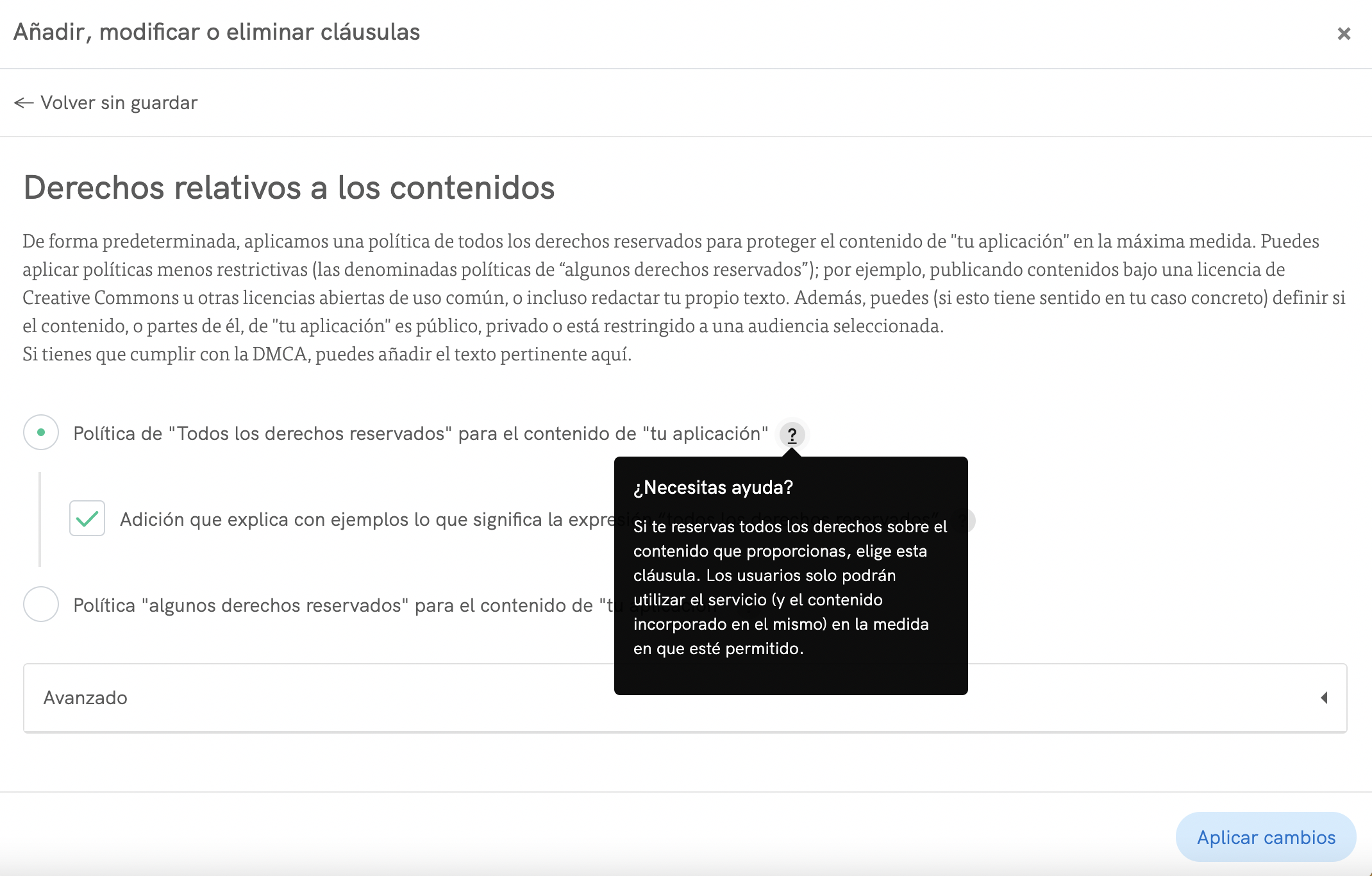 Haz clic en el botón Aplicar cambios en la parte inferior derecha de la pantalla para guardar la configuración seleccionada. Esta acción te llevará de vuelta a la ventana con las principales “cláusulas modales”. Si has terminado de personalizar tus términos, haz clic en Guardar y cerrar en la parte inferior derecha de esta ventana y continúa con el siguiente paso a continuación.