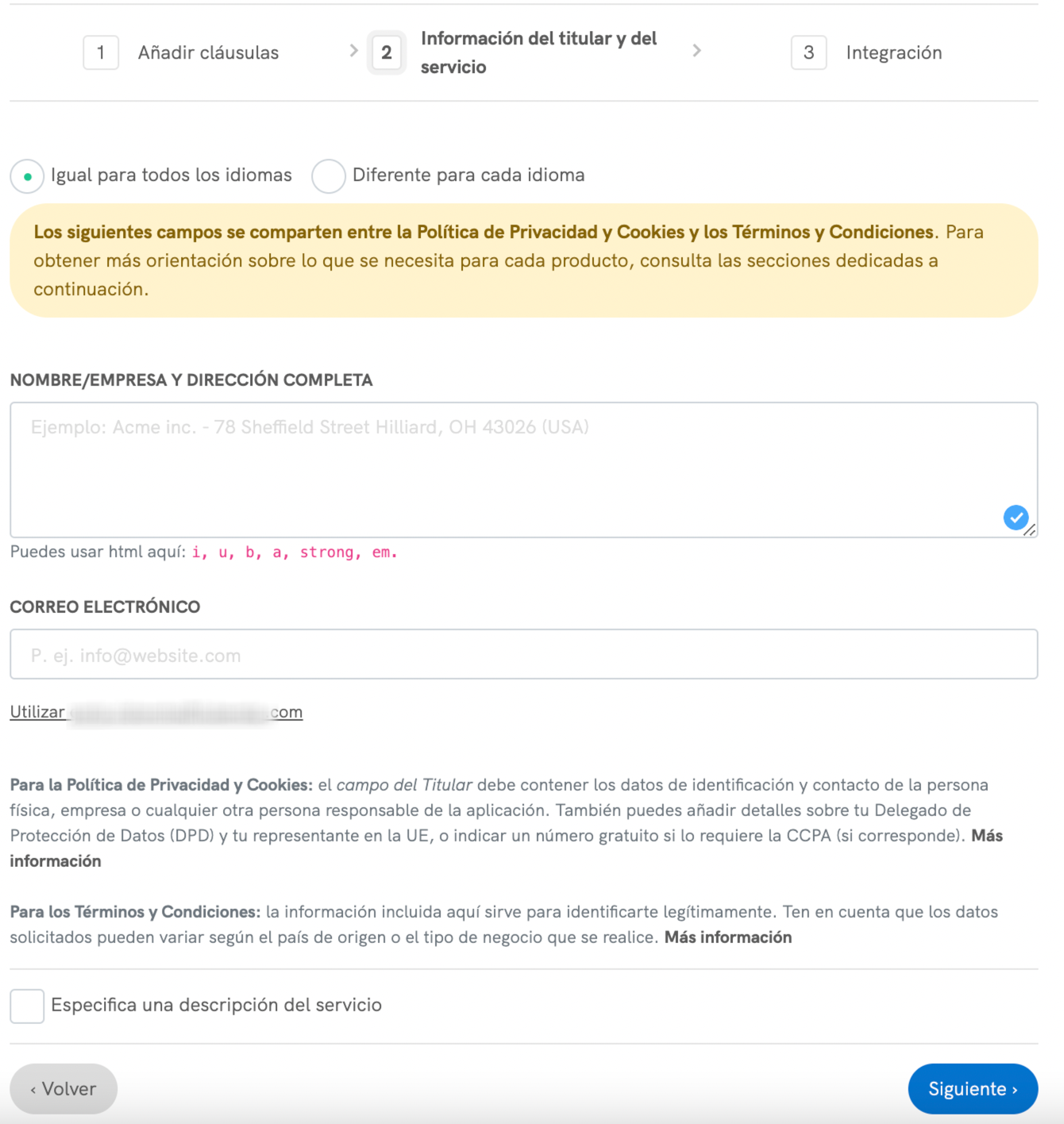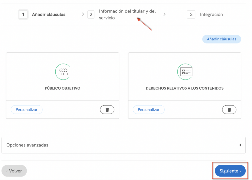 Ahora que has terminado de editar las cláusulas, tendrás que añadir la información de tu empresa en el campo del Titular. Para hacerlo, simplemente haz clic en el botón “Siguiente” en la parte inferior derecha de la pantalla.