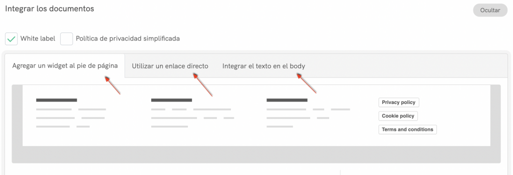 Para acceder a cualquiera de estos métodos, haz clic en la pestaña en cuestión (si ya tienes una política de privacidad activa en ese sitio web, tendrás que desplazarte hacia abajo hasta la sección de Términos y Condiciones), copia el fragmento de código o el enlace de texto, dependiendo del método que elijas, y sigue las instrucciones de la guía vinculada anteriormente.
