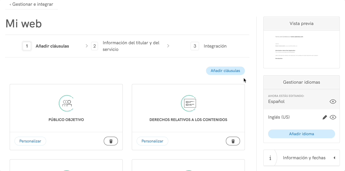 En iubenda, supervisamos constantemente las principales legislaciones, para mantener las cláusulas disponibles para tus documentos válidas y actualizadas. Sin embargo, si por alguna razón necesitas actualizar tus cláusulas, información personal, información de contacto, etc., de forma manual, puedes iniciar sesión en tu dashboard de iubenda y hacer los cambios que necesites en cualquier momento.